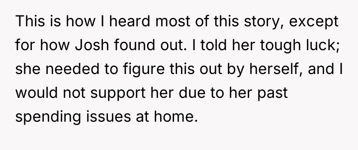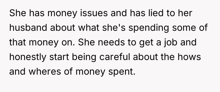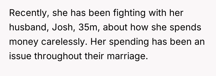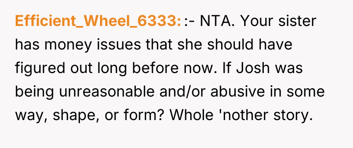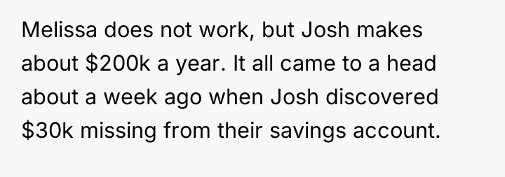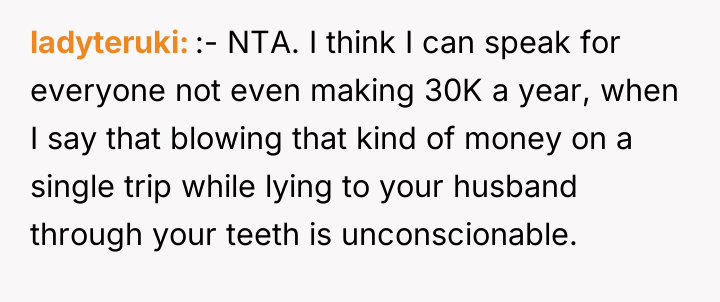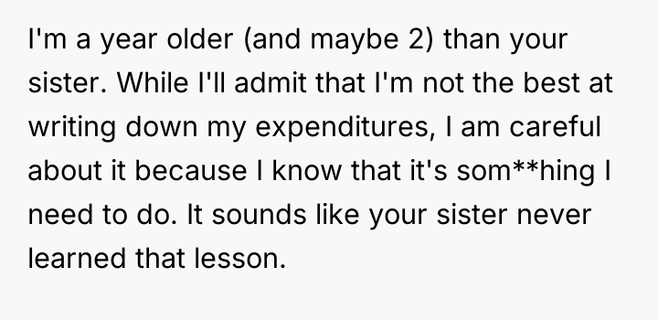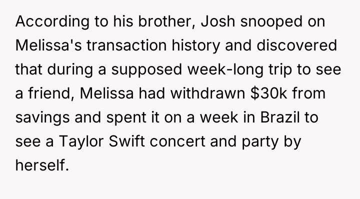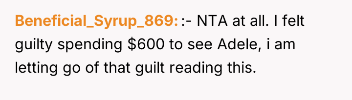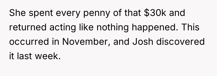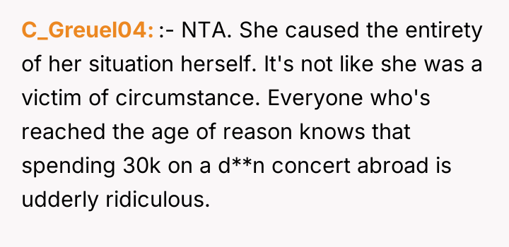 The sister's motivation appears rooted in an inability to manage impulse control regarding large expenditures, exacerbated by a lack of personal income and reliance on her husband's earnings. Spending $30,000, which constitutes a substantial portion of savings, on a solo trip for a concert demonstrates a severe lack of regard for her partner's financial security and their shared future. The brother's reaction (the Original Poster or OP) is understandable from a perspective of setting necessary personal boundaries. He has observed a pattern of irresponsible behavior and has chosen not to enable it further by offering housing, which would effectively shield her from the immediate consequences of her actions toward her husband.