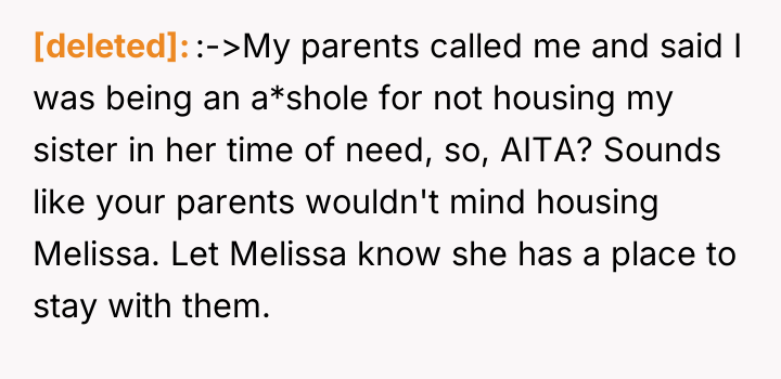 The OP's decision to refuse shelter, while emotionally difficult due to parental pressure, prioritizes long-term self-preservation and refuses to normalize severe financial misconduct. A more constructive approach in the future, when faced with a family member in crisis due to self-inflicted problems, involves offering non-financial support, such as connecting them with professional resources (e.g., financial counseling, temporary low-cost shelters, or mediation services), rather than direct financial or housing aid that reinforces enabling behavior.