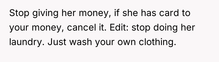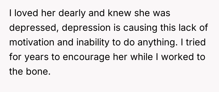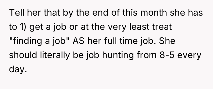 The OP's actions of performing all the domestic labor (laundry, dishes) while also working excessive overtime reinforce the unhealthy dynamic. While the OP is correct to seek separation from this unsustainable situation, threatening immediate departure without a plan risks fulfilling his fear of ruining her financially. A constructive recommendation would be for the OP to communicate a clear, non-negotiable timeline for shared responsibility (e.g., 'By X date, you must apply for Y jobs or contribute Z amount to the household'). If these conditions are not met, the OP must follow through with a less drastic, but firm, separation—such as establishing separate finances and explicitly defining the end date of shared living, perhaps offering temporary, limited financial support contingent on clear steps toward independence.