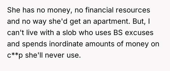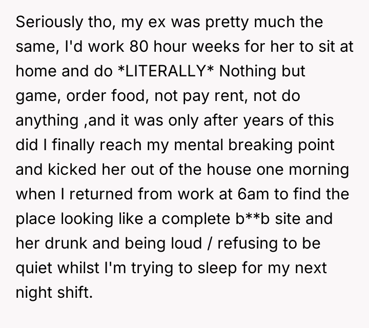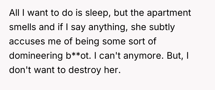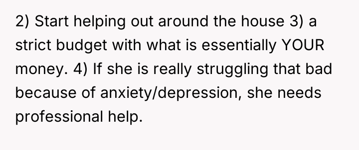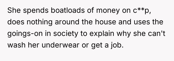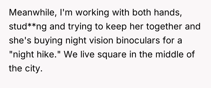 The girlfriend's behavior suggests a pattern of avoidance and potential emotional regulation issues, using constant distraction (binge-watching, impulse buying like night vision binoculars for city 'hiking') to cope with the anxiety of re-entering the workforce or facing domestic duties. The OP’s attempts to address this are met with emotional deflection and accusations of bigotry, a common tactic used to shut down constructive criticism and maintain the status quo where the burden remains entirely on the partner.