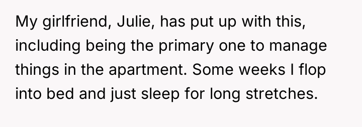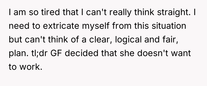 The original poster (OP) is experiencing extreme exhaustion due to carrying the entire financial and domestic load of the relationship while his girlfriend prioritizes leisure and avoids responsibility, using societal events as justification. The core conflict lies between the OP's need for partnership, stability, and rest, and the girlfriend's current pattern of dependency and financial irresponsibility.
