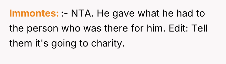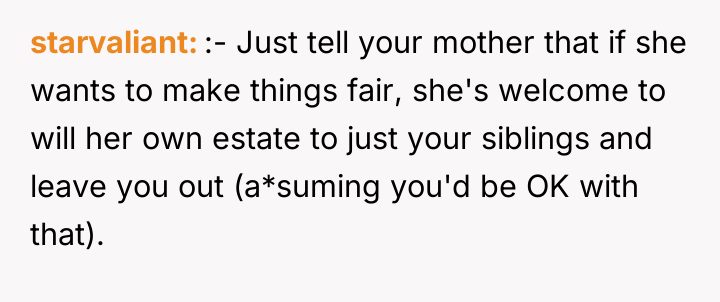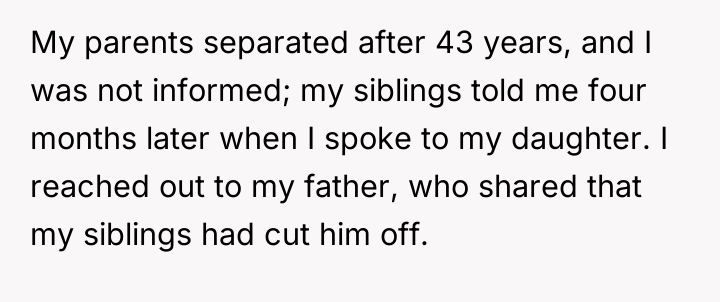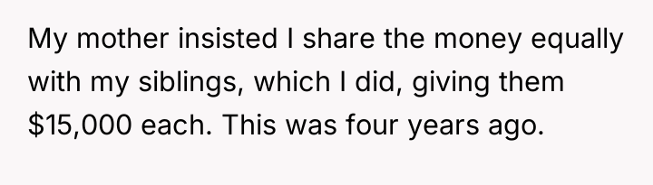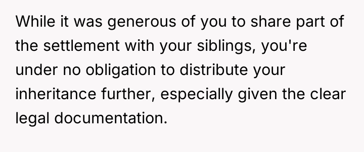 The core conflict here is not legal but emotional and relational, driven by feelings of exclusion and perceived unfairness. The daughter was estranged but became the primary emotional and physical caregiver, which often establishes an implicit contract or expectation of reward (the inheritance) that the other siblings resent because they were absent. The mother’s influence and the siblings’ initial silence after the parents' separation suggest a pattern of excluding the daughter, making their current demands feel hypocritical to her. The daughter's act of giving them $15,000 suggests an attempt to buy peace or fulfill a perceived moral obligation, which, unfortunately, only signaled to the siblings that the daughter might be willing to concede more under pressure.