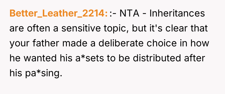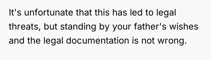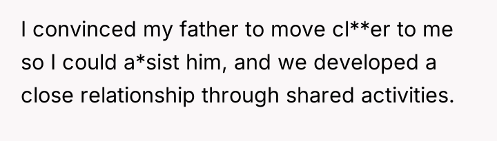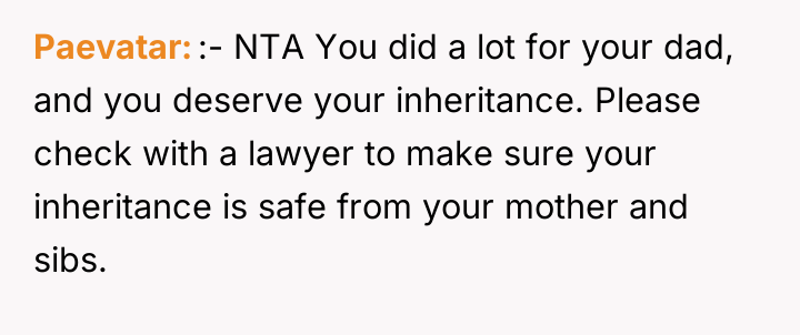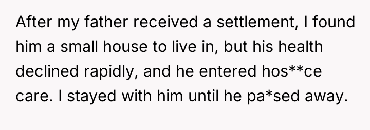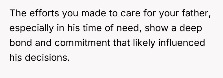 The woman deeply valued her relationship with her father, acting as his primary caregiver and advocate during his final health crises, which ultimately led to her inheriting his assets as per his explicit instructions. However, this dedication has resulted in severe familial conflict, as her siblings and mother believe they are entitled to an equal share of the inheritance, creating a four-year-long dispute over the ownership of the house and the money already shared.