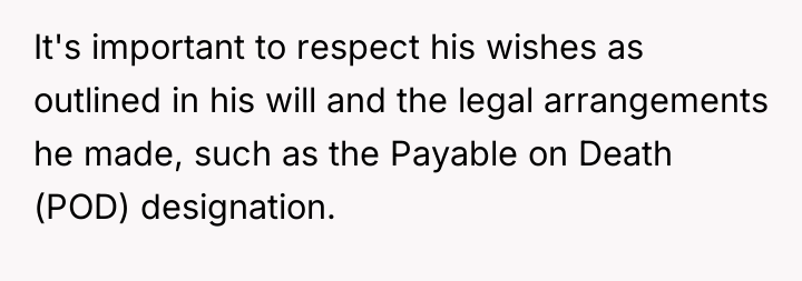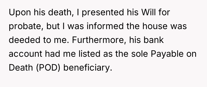 According to estate planning experts like those cited by the American Bar Association (ABA), the designation of a Payable on Death (POD) beneficiary on a bank account bypasses the probate process entirely, meaning the funds legally belong to the named individual (the daughter) upon the owner's death. Similarly, if the house was legally deeded to her or if the Will clearly named her as the sole beneficiary and that Will was executed correctly, her claim to the property is legally sound, independent of the siblings' desires.