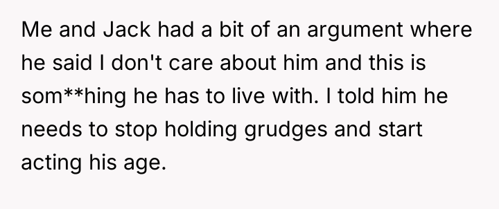 Jack's behavior suggests an attempt to control his parents' emotional investment and presence using guilt ('you don't care about me') and by demanding they share his exclusionary stance. This is a common pattern where an adult child attempts to enforce emotional boundaries based on their own subjective history rather than respecting the autonomy of their parents or sibling. The parent's response, while perhaps intended to be firm ('act your age'), risks escalating the conflict by invalidating Jack's feelings, even if those feelings are misplaced.