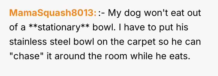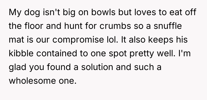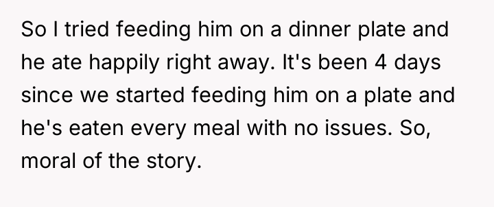 Given that the dog is now eating happily off a plate, the core conflict—the dog's refusal to eat versus the owner's need to nurture it—appears resolved. The central question remains: How much specialized adaptation, beyond standard practice, should an owner reasonably provide for a pet's specific, non-medical sensory preferences?