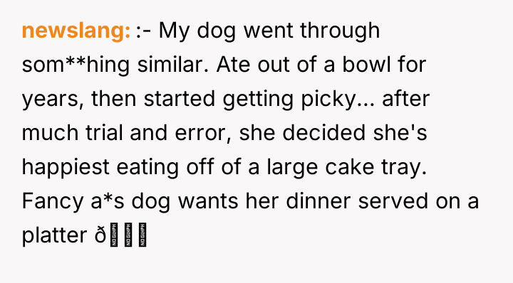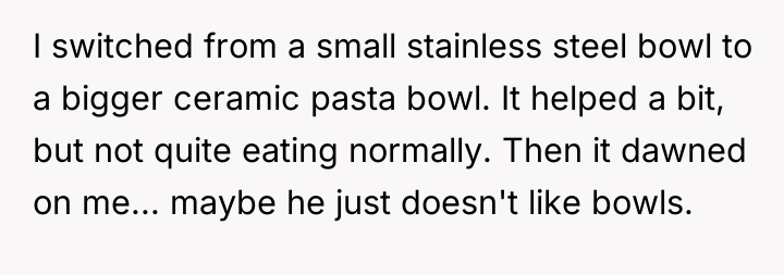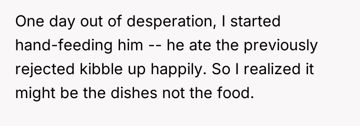 The original poster experienced significant frustration trying to solve their rescue dog's eating refusal, moving through various solutions until discovering the issue was sensory, related to the shape of the feeding dish rather than the food itself. This journey highlights the intense emotional investment owners place in their pet's well-being, often leading to desperation when standard solutions fail.