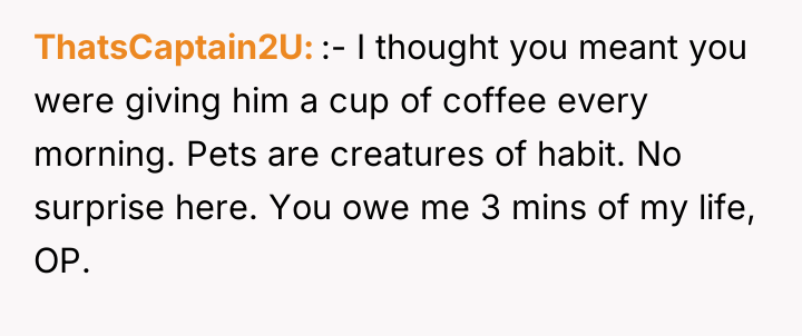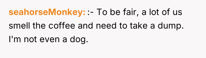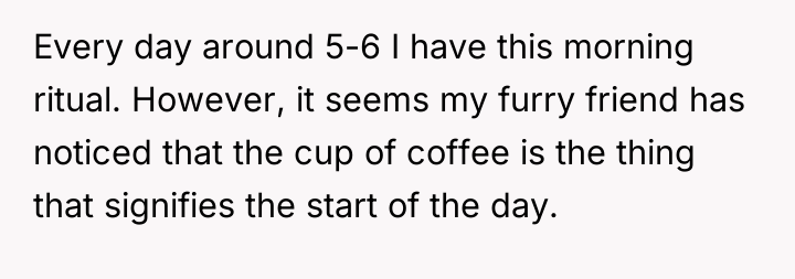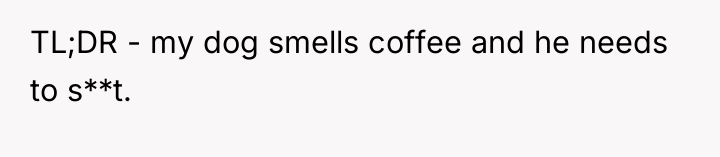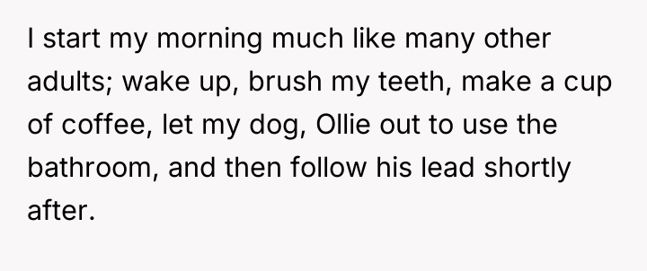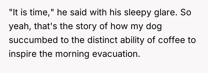 The individual discovered a surprising and consistent connection between their morning coffee ritual and their dog's need to go outside. This created a predictable, albeit slightly inconvenient, pattern in their daily routine.