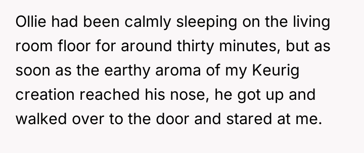 Dr. Ian Dunbar, a veterinarian and animal behaviorist, often emphasizes the importance of understanding and responding to an animal's established routines and clear communication signals. In this scenario, the dog, Ollie, has clearly associated the distinct sensory cue of coffee preparation (the 'earthy aroma of my keurig creation') with the subsequent need for elimination.