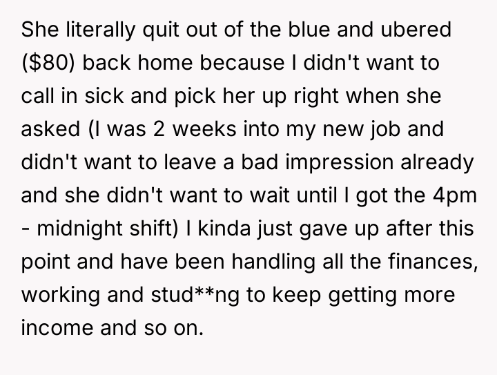 Every early morning spent driving her to a job she soon abandoned chipped away at his spirit, revealing a painful imbalance in their partnership. Her unexpected resignation and costly Uber ride home became the breaking point, a silent scream of frustration and heartbreak in a relationship strained by unspoken burdens and unmet expectations.
