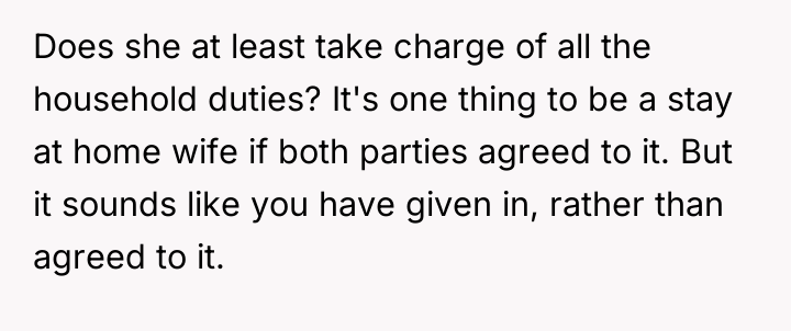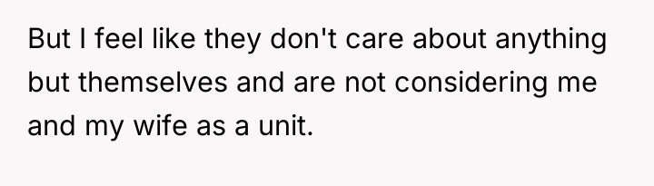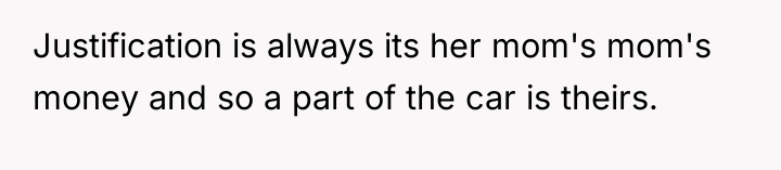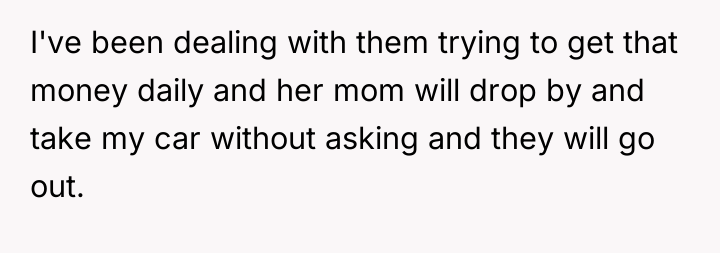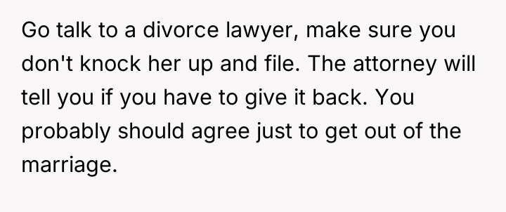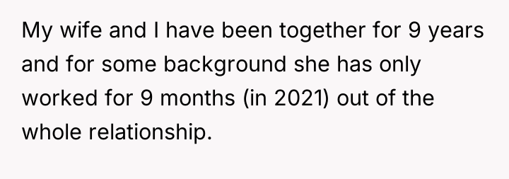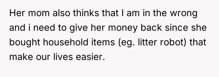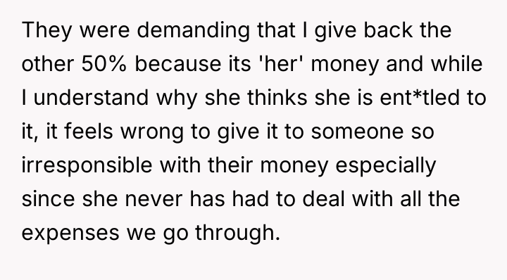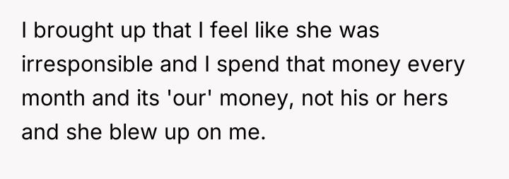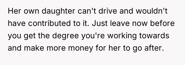 The husband has taken on the entire financial and academic load for the partnership, while the wife has historically avoided gainful employment and, upon receiving an inheritance, immediately made significant, non-essential purchases without consulting him as a financial unit. Her justification for demanding the return of the $3,000—which the husband argues should be treated as shared marital assets given his financial management—highlights a severe misalignment in perceived contribution and entitlement. The mother's escalation, including taking the car without permission, further indicates a lack of respect for the husband's role and the couple's autonomy.