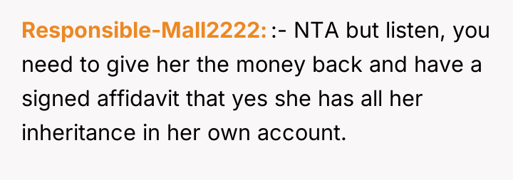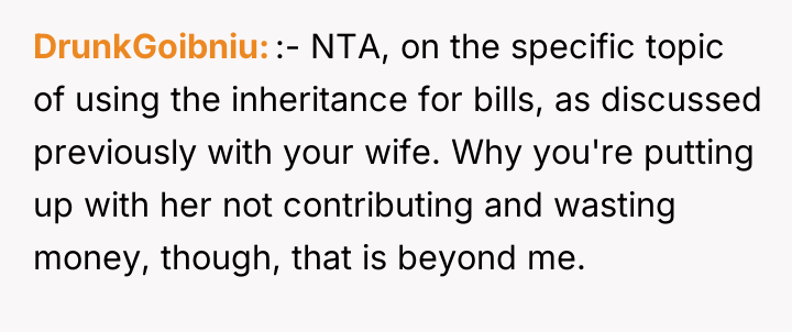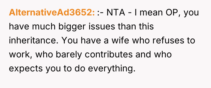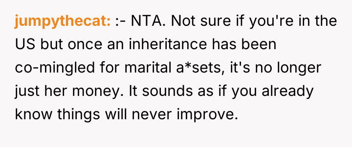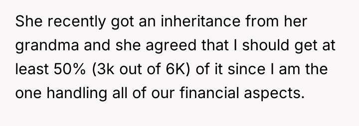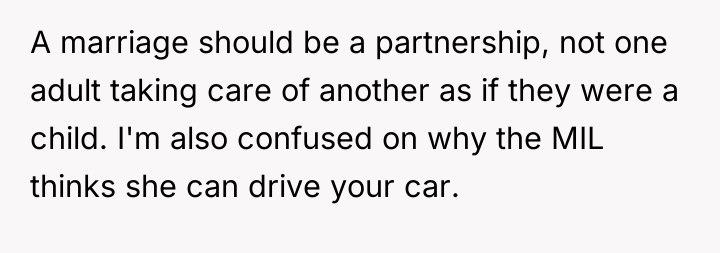 The husband's actions in managing the money based on his functional role (handling all expenses) were an attempt to create structure where his wife failed to contribute. However, by allowing the situation to escalate to the point where he feels entitled to control her inheritance, he has moved from boundary setting to control. Moving forward, the constructive approach is to immediately stop managing her inheritance funds, clearly communicate that future joint expenses must be planned together, and firmly address the mother's behavior regarding the vehicle. If a joint financial agreement cannot be reached, the OP must seek couples counseling to redefine roles and boundaries before this control issue permanently damages the marriage.