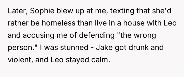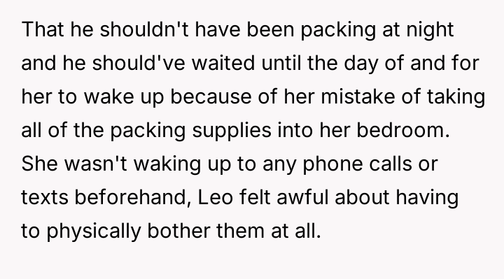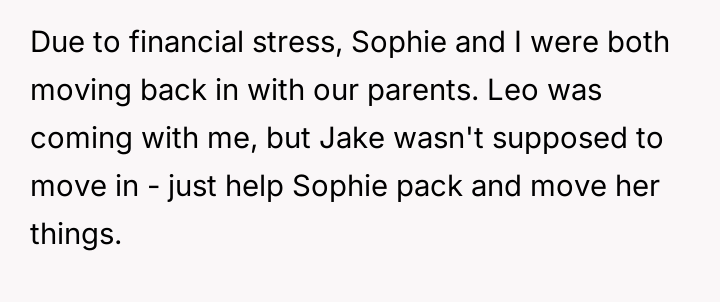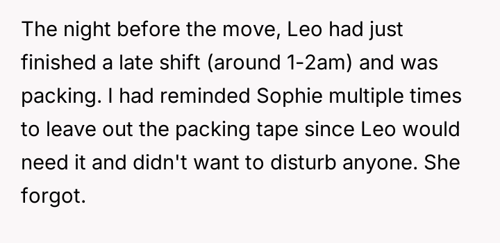 After reading through the Reddit comments, it’s clear that many people sympathize with the original poster (OP) for dealing with Jake’s unexpected behavior and the tension it caused late at night. Most commenters agree that Jake overstepped by storming out aggressively when Leo was just trying to get some packing tape, an innocent request. It seems that Jake’s reaction was seen as controlling and immature, especially given that he was supposed to be helping Sophie with the move, not causing conflict. Many users advised OP to have an honest conversation with Sophie about boundaries and to be cautious about how Jake’s behavior might affect their family dynamics moving forward.