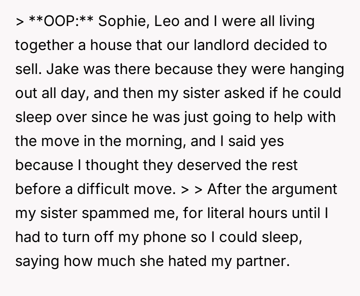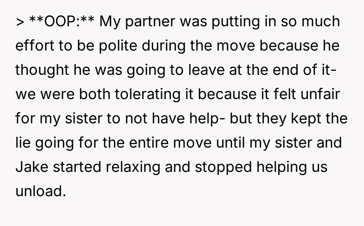 In my opinion, this situation highlights the importance of clear communication and respect when multiple people are involved in a stressful event like moving. While it’s understandable that late-night packing can be tiring, Jake’s reaction was disproportionate and created unnecessary drama. It’s crucial for OP and Sophie to support each other, especially during tough times, and to ensure that their partners respect their boundaries. Hopefully, this incident serves as a wake-up call for everyone to be more considerate and keep peace in what should be a supportive family environment.