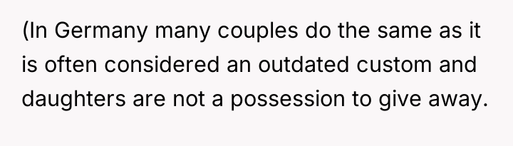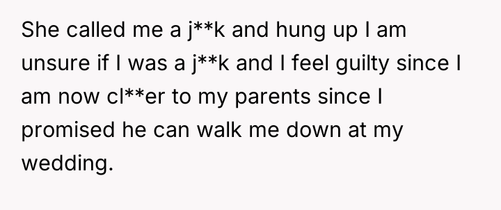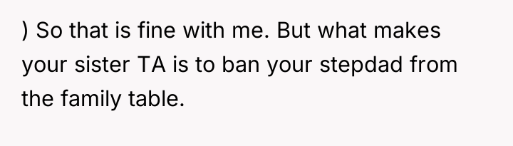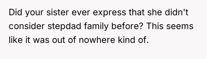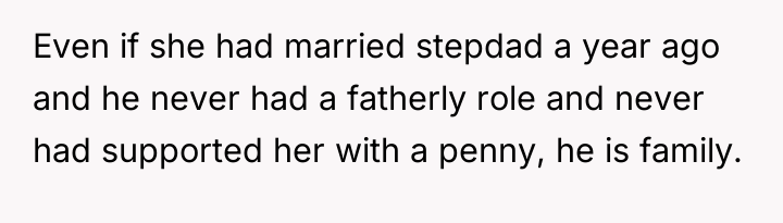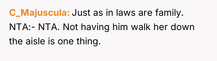 cause repercussions. The comments on Reddit were divided, with many empathizing with the stepdad’s position, recognizing his sacrifices and the emotional weight of being excluded from such a pivotal moment. Others supported Noelle’s right to make her own decisions about her wedding and family dynamics, emphasizing that the term "family" can be subjective and personal. What stood out was the importance of communication and empathy on both sides, as well as the recognition that weddings often bring long-standing family tensions to the surface.