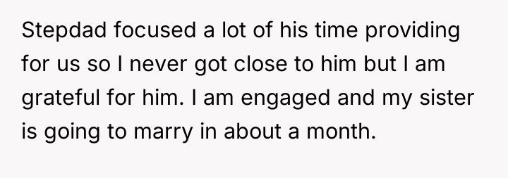 In my view, the situation highlights how complex blended family relationships can be, especially when it comes to significant life events. While Noelle has every right to make her wedding about what feels right to her, dismissing the role and efforts of their stepdad seemed harsh and dismissive of his contributions. It’s a reminder that appreciating the people who’ve shaped our lives, even if they aren’t traditional family, can enrich our celebrations rather than diminish them. Hopefully, with time and honest conversations, they can find a way to honor everyone’s feelings and heal these wounds before the wedding day.