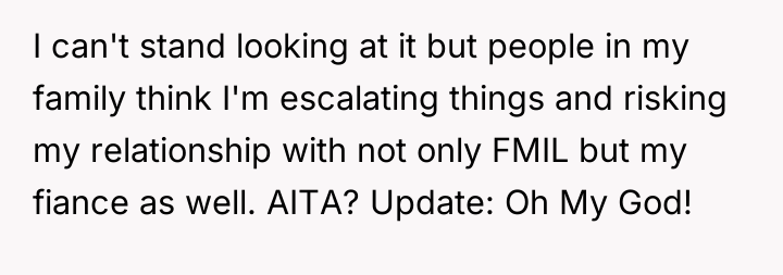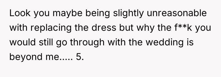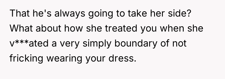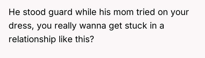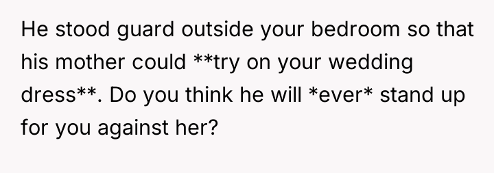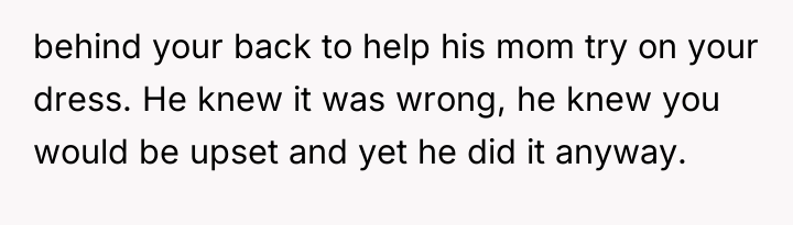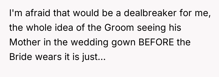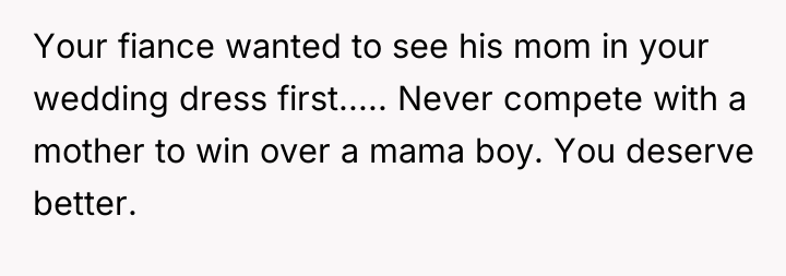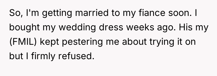 In my opinion, this situation highlights the importance of setting and respecting boundaries, especially around such significant life events. The FMIL’s obsession with the dress came off as selfish and controlling, and the fiancé’s failure to support his bride raises red flags about family dynamics. Trust and respect should be the foundation of any relationship, and those were clearly compromised here. Hopefully, the bride and groom can have an honest conversation and establish clearer boundaries with his mother moving forward, ensuring their special day remains truly theirs.