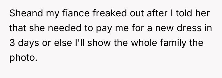 AITA for giving FMIL 3 days to pay me for a new wedding dress or else I show the family a photo of her wearing it?