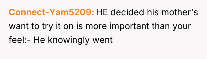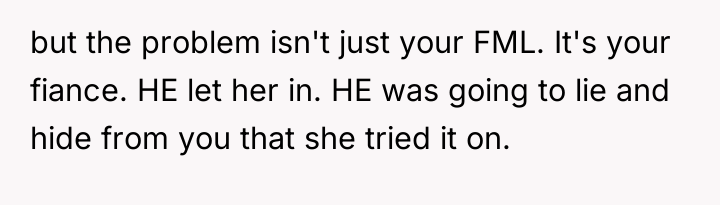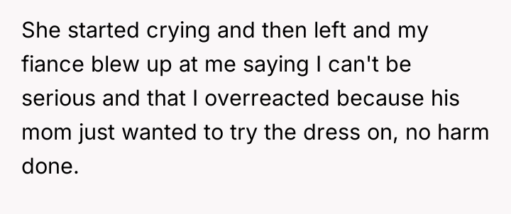 Reading through the Reddit comments, many users sided firmly with the bride-to-be, emphasizing that the FMIL's behavior was a clear boundary violation. The consensus was that a wedding dress is deeply personal, and the mother-in-law's insistence on trying it on—even going so far as to wear it without permission—was disrespectful and inappropriate. Commenters praised the bride for standing her ground and handling the situation assertively, noting that her fiancé’s reaction was troubling and suggested he might be enabling his mother’s intrusive behavior. Several also advised the bride to consider couple’s counseling to address these issues before the wedding day.