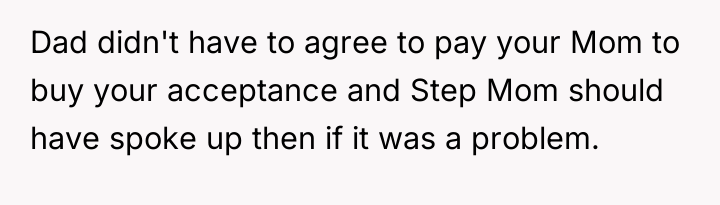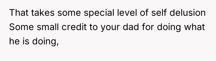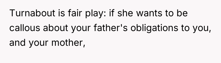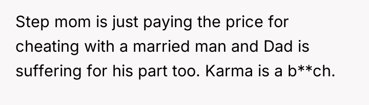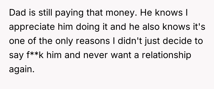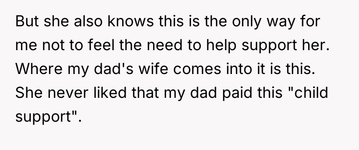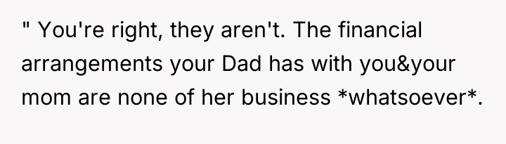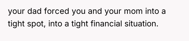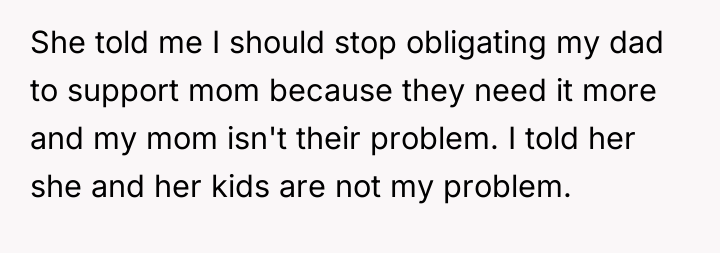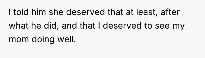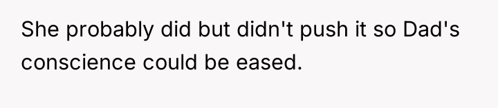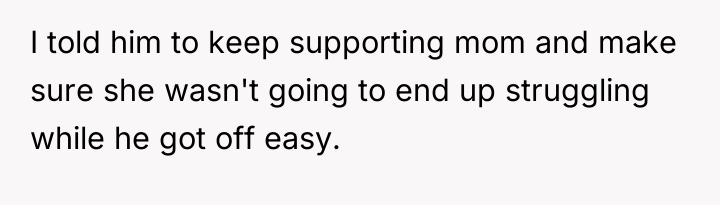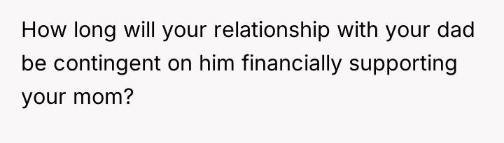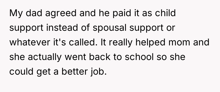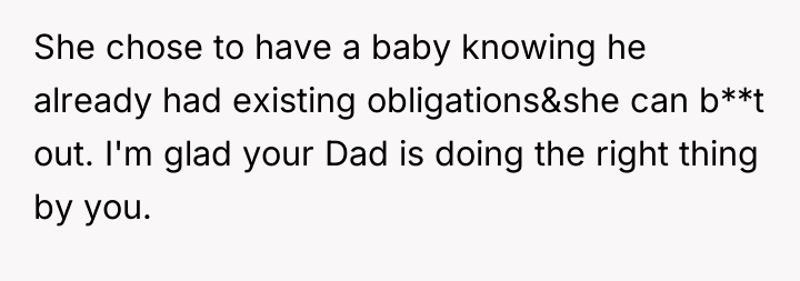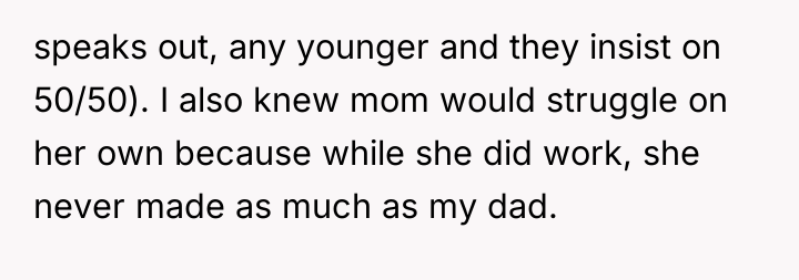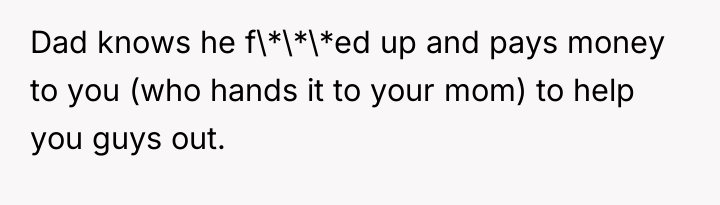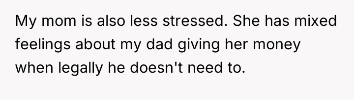 In my opinion, this story highlights the difficult balance children of divorced or separated parents often must find between their feelings and practical realities. It’s not easy to forgive or overlook betrayal, especially when it impacts the entire family’s stability. The OP’s choice to insist on their father supporting their mother financially reflects a nuanced sense of justice and care that many might overlook. Ultimately, it's a reminder that every family’s path to healing is unique and that sometimes, standing firm on what feels right is the most important step toward moving forward.