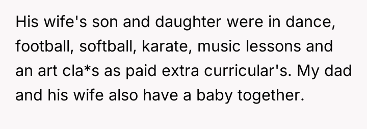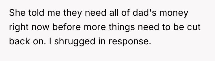 AITA for shrugging when my dad's wife told me they need all of dad's money right now?