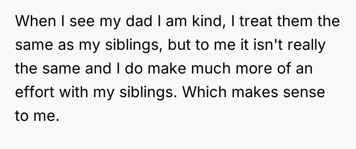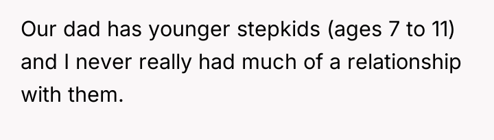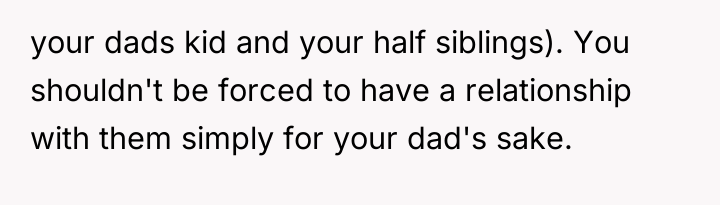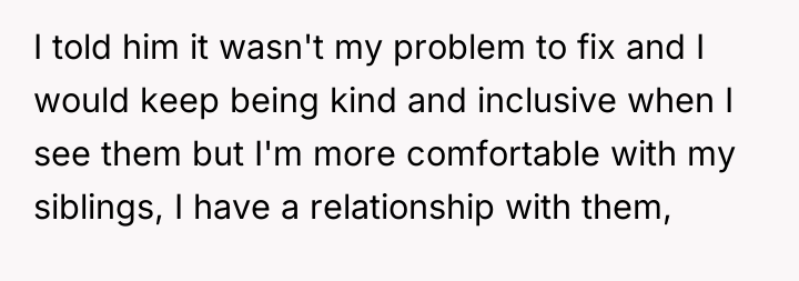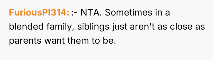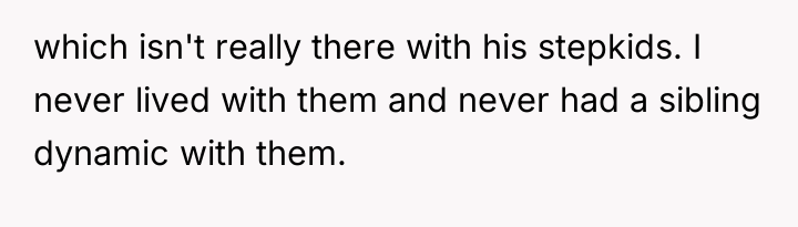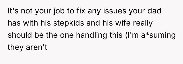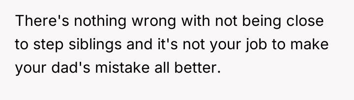 After reading through the Reddit comments, it’s clear many people sympathize with the original poster’s position. Many commenters pointed out that it’s completely normal to have closer bonds with biological siblings, especially when they've shared a lifetime of experiences together. The stepkids, while part of the family, don’t have the same history or emotional connection, so it’s understandable that the OP doesn’t feel the need to treat them exactly the same. Several users also emphasized that it’s the dad’s responsibility to manage the dynamics between his children and his new family, rather than forcing the OP to bridge gaps that organically might not exist.