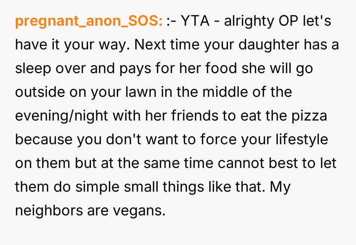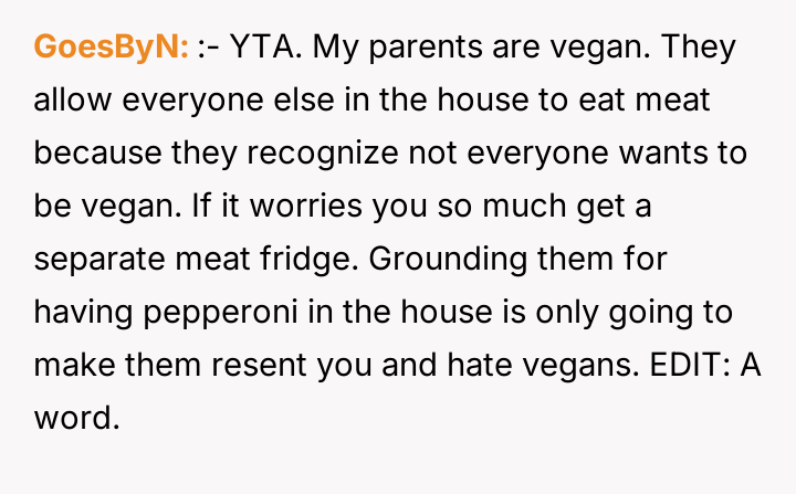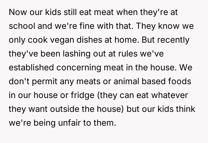 After reading through the Reddit comments, it's clear that this situation has sparked a lot of debate about parental authority, respect, and individual choice. Many commenters sympathize with the parents for wanting to maintain their household rules and promote their ethical beliefs. However, others point out that the kids are in their teenage years and naturally starting to assert their independence. The strict ban on any animal products in the house, combined with punishing the daughter for having friends over who ordered meat, seems to have caused more tension than constructive dialogue. Some suggest that a more flexible approach, such as allowing occasional exceptions or negotiating rules with the kids, might reduce the conflict and foster mutual respect.