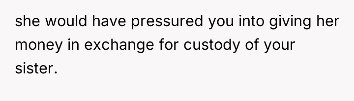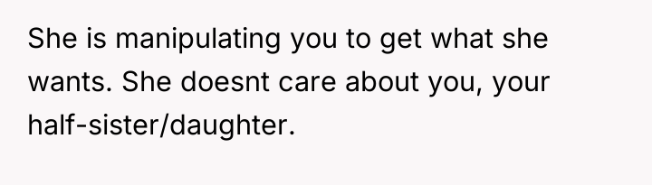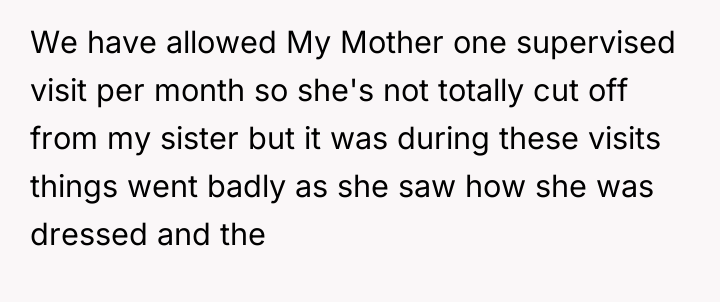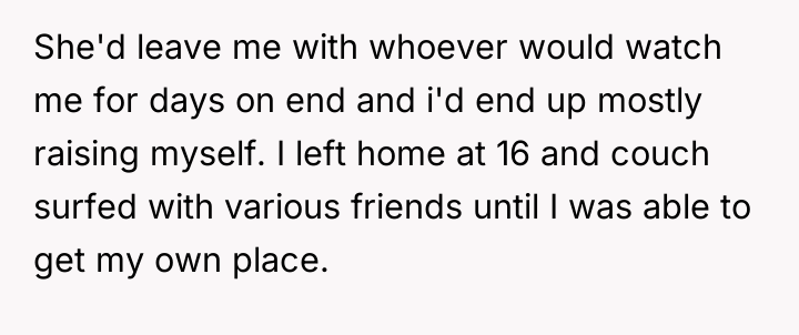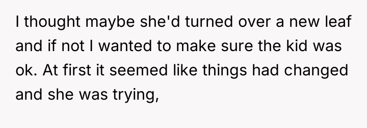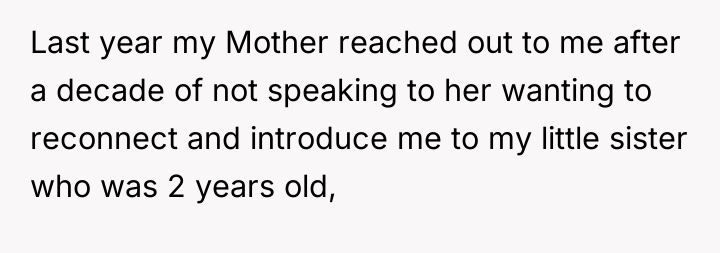 rebuild some form of relationship, if only for my sister’s sake. I agreed to meet and eventually met my sister, who was sweet and innocent, a stark contrast to the chaos of my own childhood. However, as time went on, my mother’s old patterns resurfaced. She would be inconsistent, sometimes affectionate, other times neglectful or unreliable. It became clear to me that while I wanted to give her a chance, the past couldn’t be erased so easily. I found myself torn between protecting my emotional well-being and giving my sister a connection to family.
