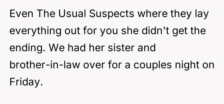 Little did he know, this pattern of movie selection was about to be challenged. A casual Friday night turned into a cinematic showdown when his wife's sister and brother-in-law arrived, armed with a taste for thrillers. The husband, anticipating the inevitable confusion, tried to steer them towards something more manageable. But alas, his pleas fell on deaf ears. The group was set on a mind-bending film, and our protagonist could only watch as his wife struggled to keep up, much to the silent judgment of their guests. This set the stage for a post-movie confrontation that would test the very foundations of their understanding.