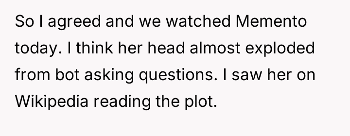 In a move that could be seen as either a grand gesture of love or a desperate attempt to prove a point, the husband agreed to watch a notoriously complex film, 'Memento,' with his wife. The tension in the room was palpable as the non-linear narrative unfolded. To his surprise, his wife remained remarkably quiet, her brow furrowed in concentration. However, the victory was short-lived. Later, he discovered her secretly consulting Wikipedia, trying to piece together the fragmented plot. This revelation brought him back to his original dilemma, leaving him wondering if he had truly bridged the gap or simply found a new way to highlight their differing approaches to storytelling.
