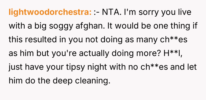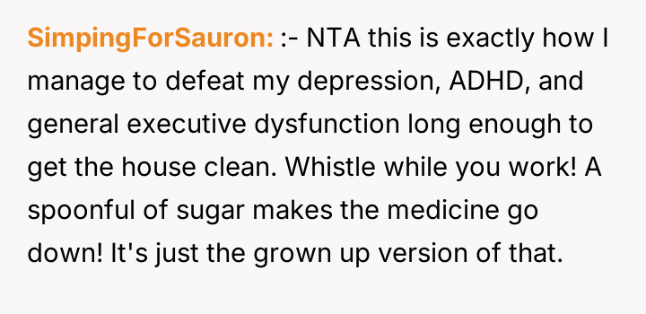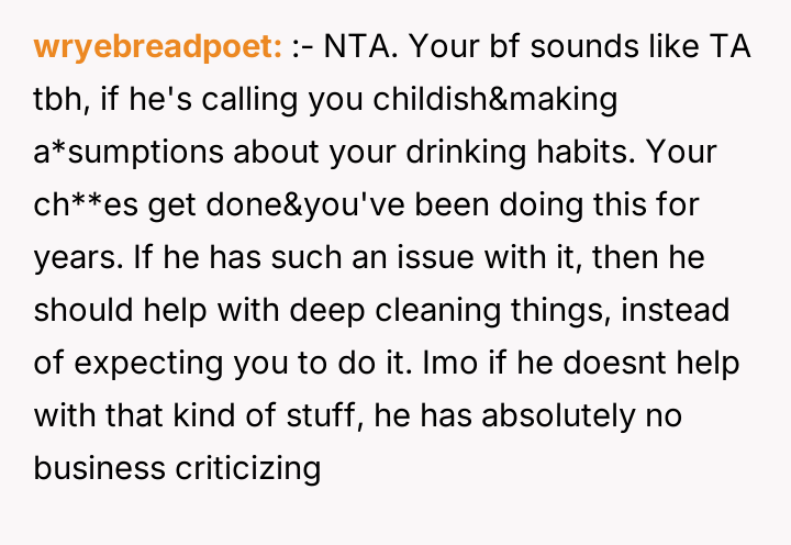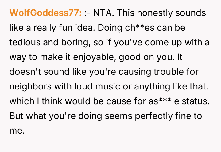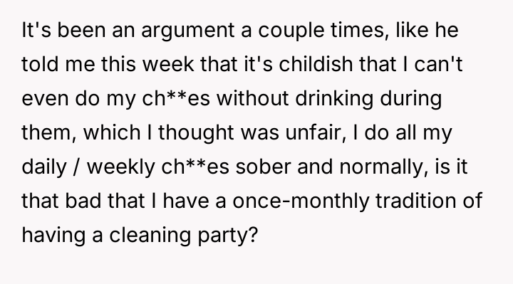 'AITA for having the habit of making a party out of "chore day" - drinking, dancing around, music on, etc...'