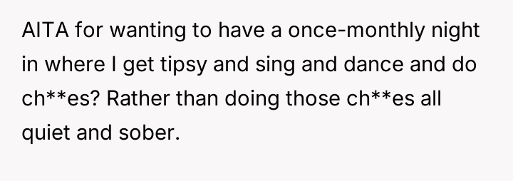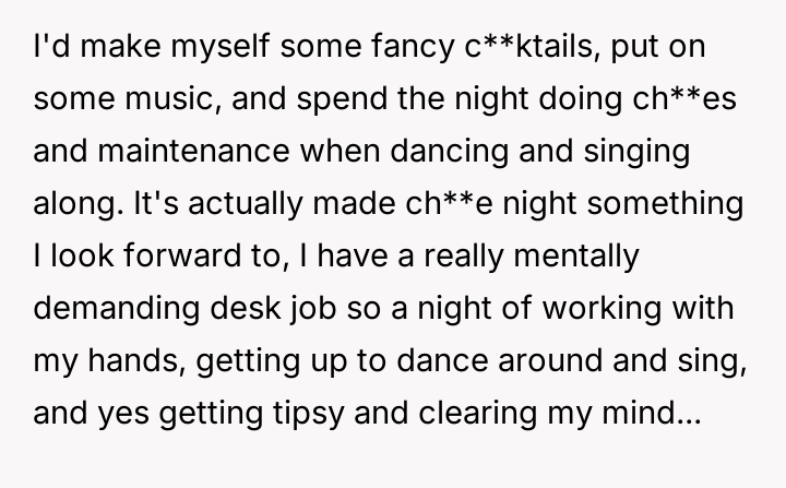 AITA for having the habit of making a party out of "ch**e day" - drinking, dancing around, music on, etc...