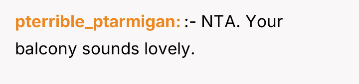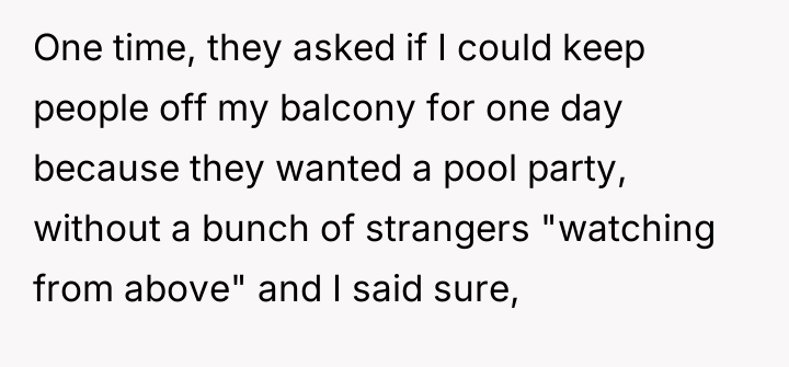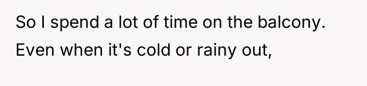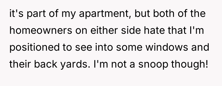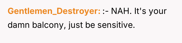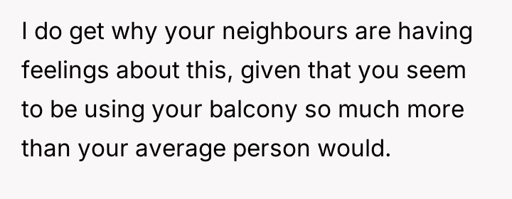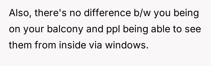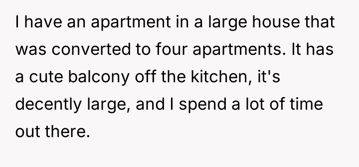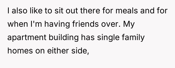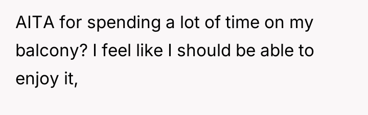 AITA for spending a lot of time on my apartment balcony? It overlooks two neighbors yards and they're mad about their families lacking privacy.