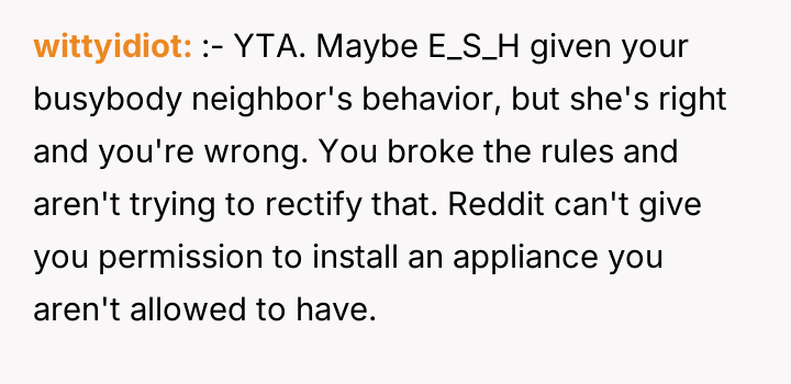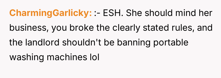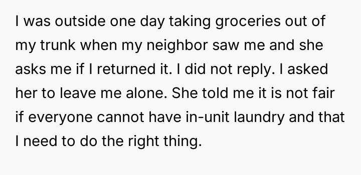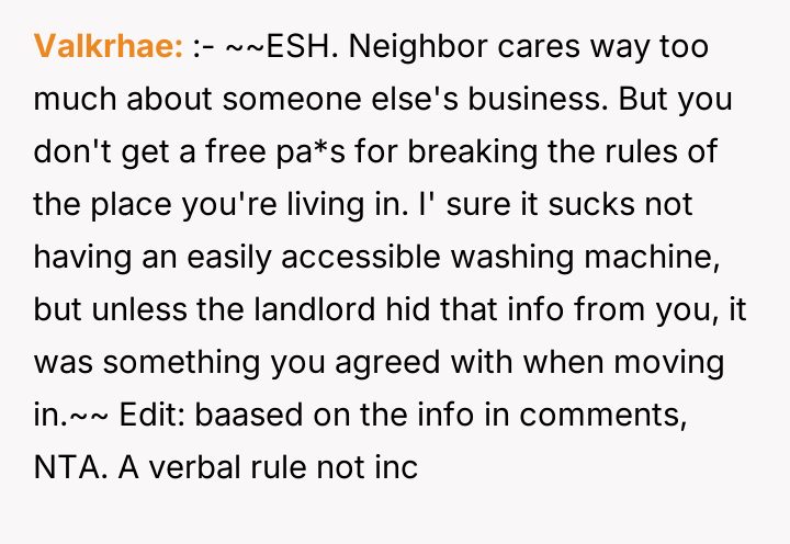 After reading through the Reddit comments, it's clear that opinions are divided on this situation. Some users empathize with the neighbor and landlord, highlighting the importance of respecting community rules and the potential consequences of breaking them, such as rent increases or strained relationships. Others feel that the original poster has a right to seek convenience and modern amenities, especially if the building lacks in-unit laundry options. Many commenters suggest better communication and compromise might help ease tensions rather than escalating conflicts.