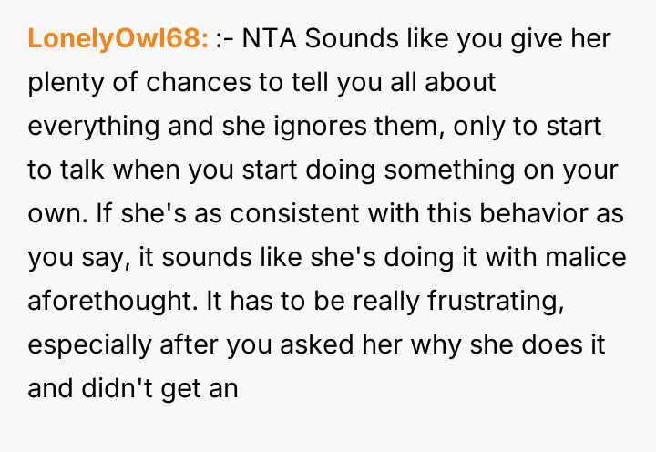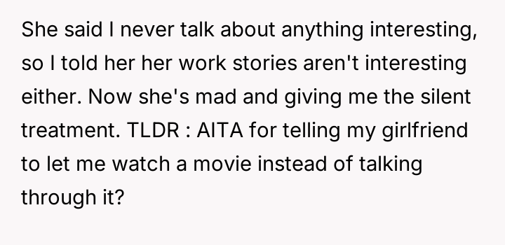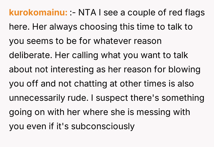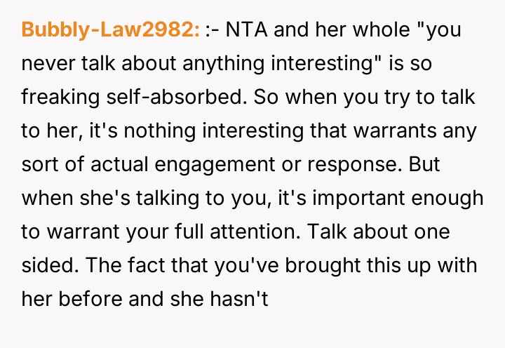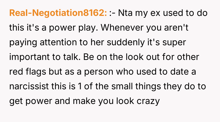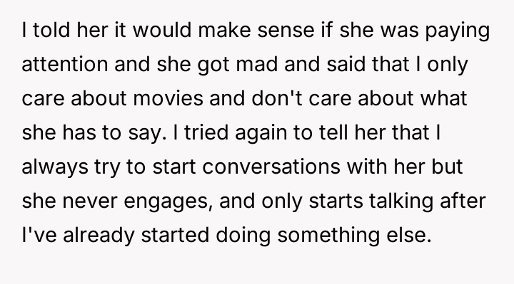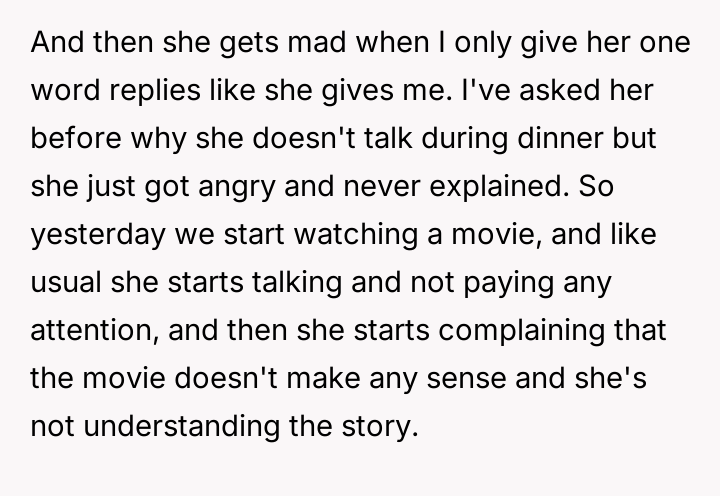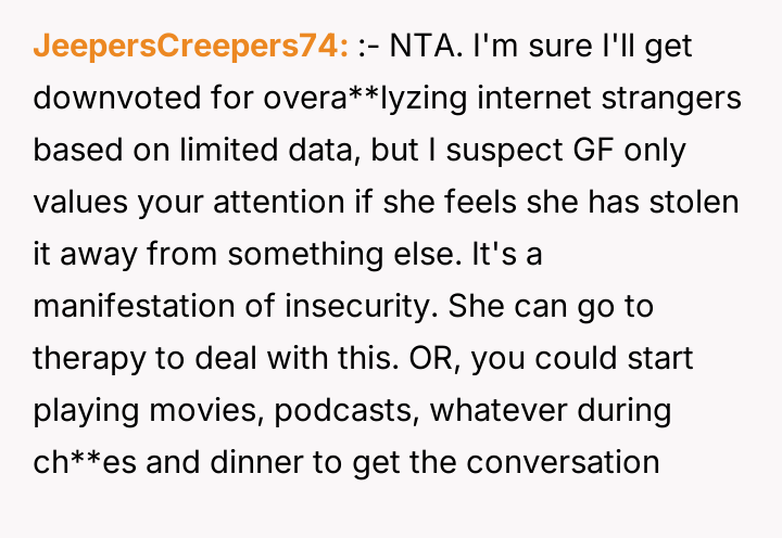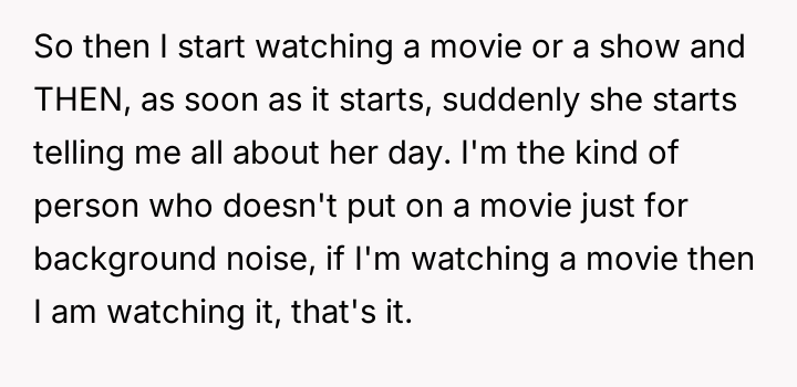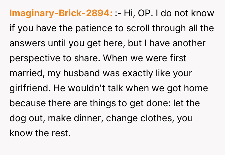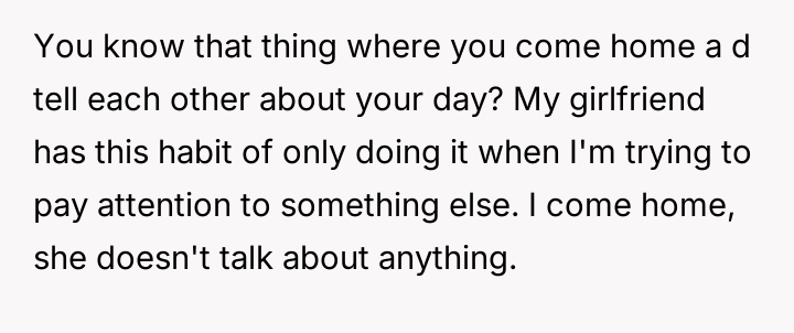 After reading through the Reddit comments, it's clear that many people relate to the frustration of feeling like communication happens only when it's inconvenient or when attention is divided. Commenters suggested that this behavior might stem from your girlfriend processing her day in a way that requires background distraction, or perhaps she's struggling to find the right moment to open up when full attention is expected. Others recommended having a direct conversation about how you both prefer to share your experiences to find a balance that works for you.