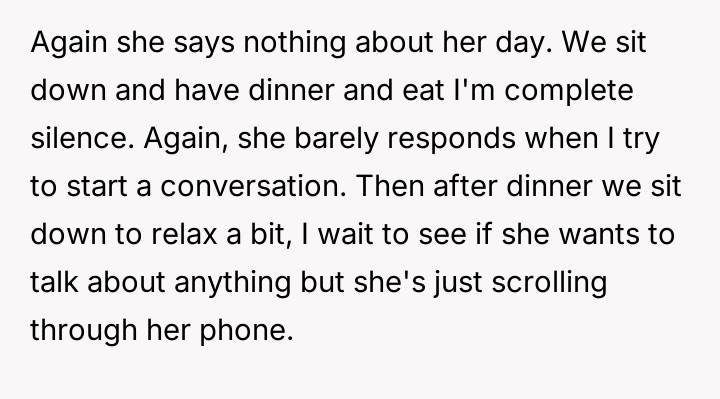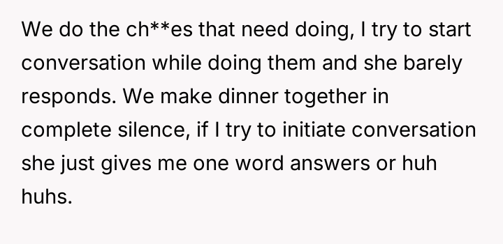 He walks through the door, hoping to find a connection, a moment to share, but is met with silence. Each attempt to bridge the gap is met with distant one-word answers, the warmth of conversation fading into the cold routine of ch**es and quiet dinners. His heart aches as he tries to reach her, only to be met with the hollow echo of indifference.