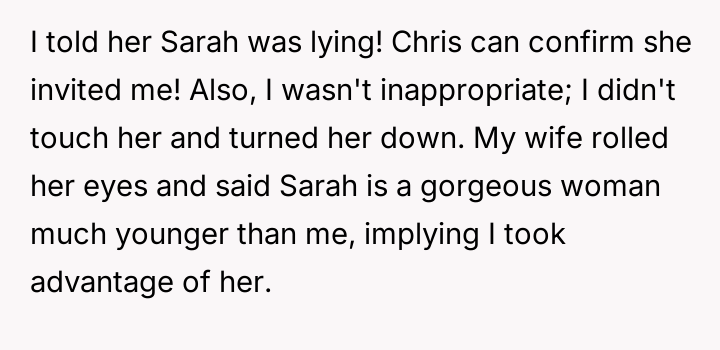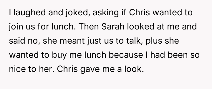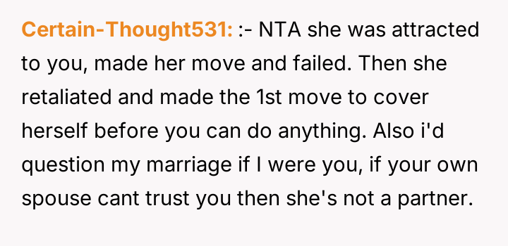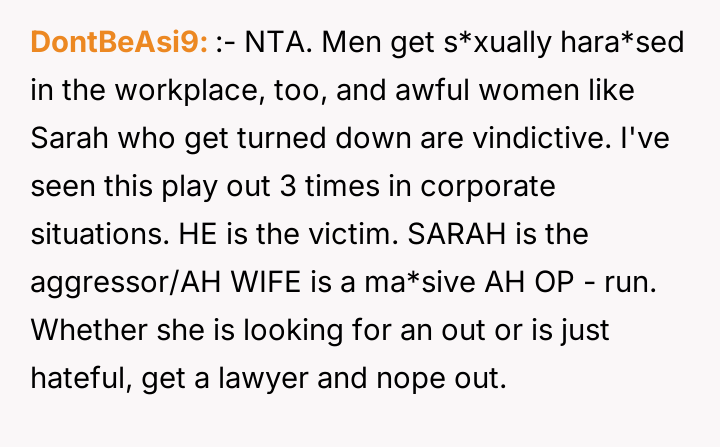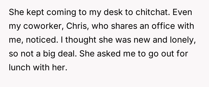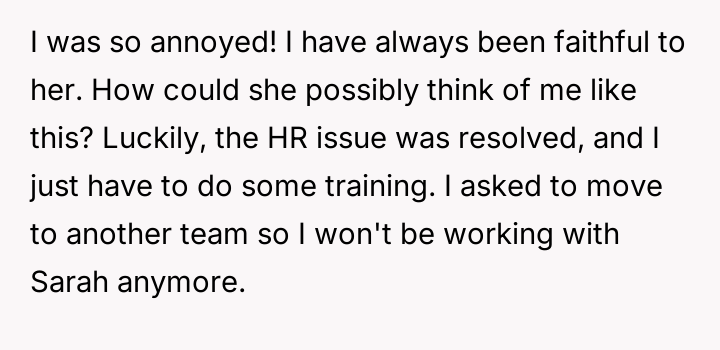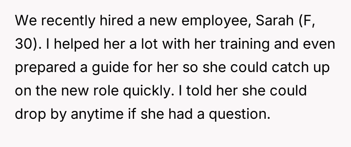The story clearly highlights the complexities that can arise in workplace relationships, especially when boundaries become blurred. The husband’s initial kindness and willingness to help Sarah with her training were well-intentioned, but the situation escalated in a way that put him in a difficult position both professionally and personally. Many Reddit commenters empathized with his predicament, noting that while his actions were innocent, Sarah’s behavior was inappropriate and could easily be misinterpreted, potentially causing damage to his marriage and reputation.