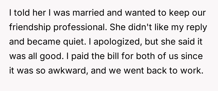 Overall, this story serves as a reminder of the importance of maintaining clear professional boundaries and being mindful of how actions might be perceived by others. Transparency with one’s spouse and setting firm limits with colleagues can help prevent misunderstandings and protect relationships. The Reddit community’s varied responses reflect how tricky these situations can be, but most agree that honesty and communication are key to navigating such challenges.