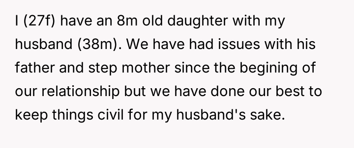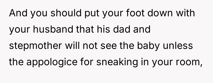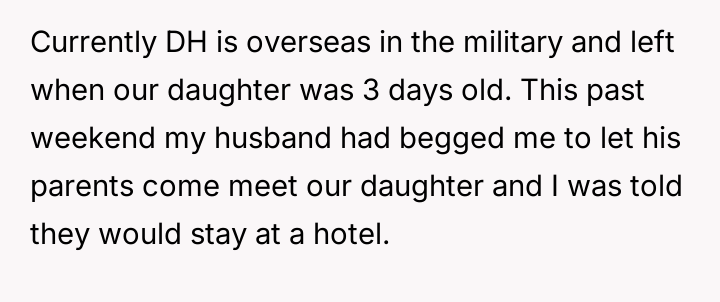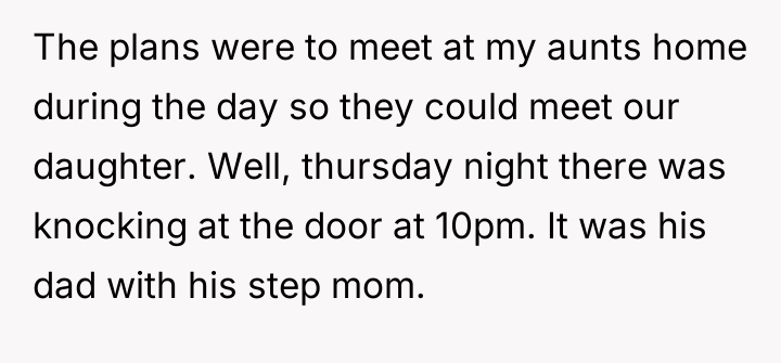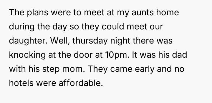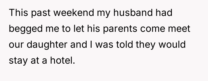In my opinion, maintaining healthy boundaries is crucial, particularly with a newborn and sensitive family dynamics. While it's understandable that the grandparents wanted to meet their granddaughter, their approach was intrusive and inconsiderate. The mother deserves respect and support in her home, and the husband should prioritize his family's well-being by addressing these issues firmly. Open communication and mutual respect will be key to navigating this challenging situation.