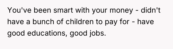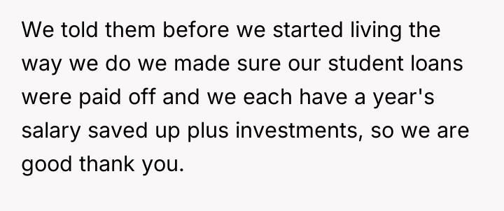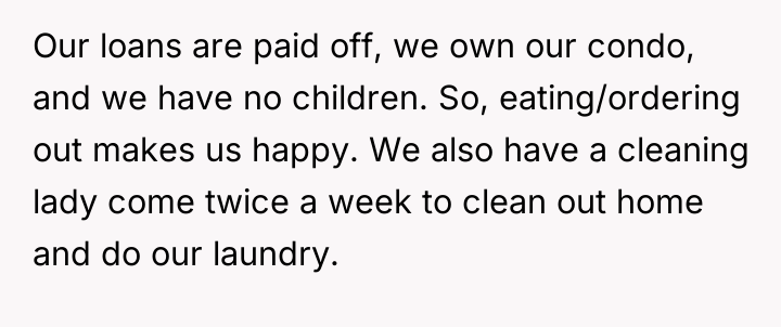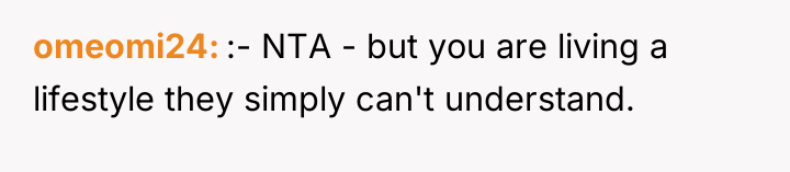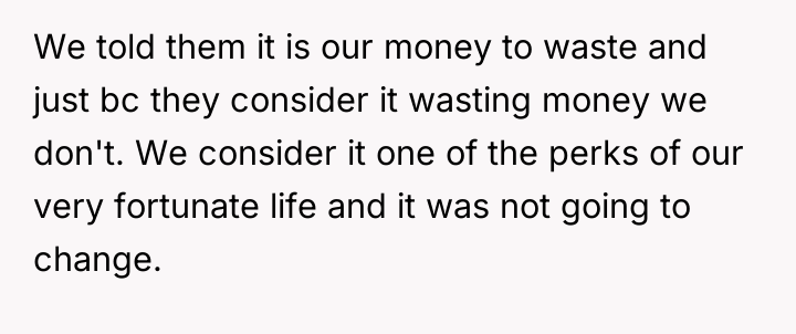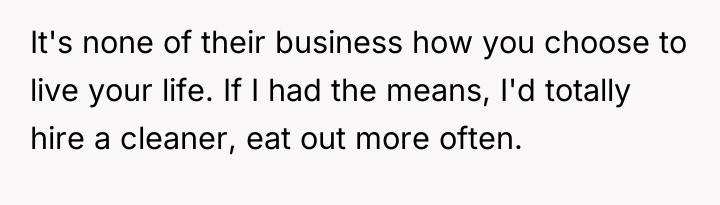 After reading the Reddit comments, it’s clear that many people empathize with the couple’s lifestyle choice. Their approach to balancing demanding careers with personal happiness—prioritizing convenience and enjoyment over traditional expectations—resonates with a lot of readers. Several commenters admire their financial independence and stress-free attitude, while others suggest that communication and setting boundaries with family around such differences is key.