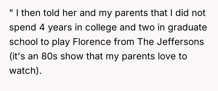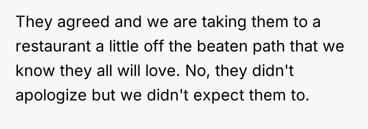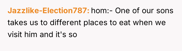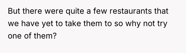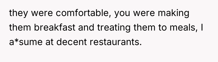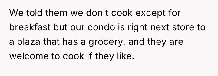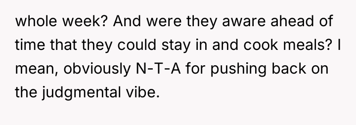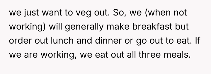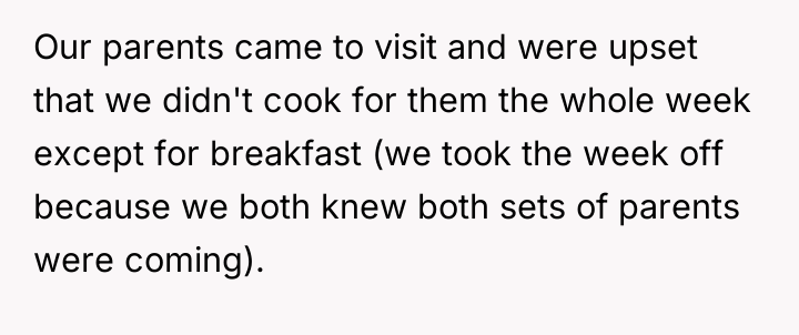 In my opinion, the couple’s decision to maintain their routine despite parental expectations is completely valid. Everyone should be able to enjoy their time off in a way that suits them best without feeling obligated to conform to others’ ideas of hospitality. The parents could have embraced the opportunity to explore new restaurants or even cook themselves, fostering a more relaxed and understanding visit overall.