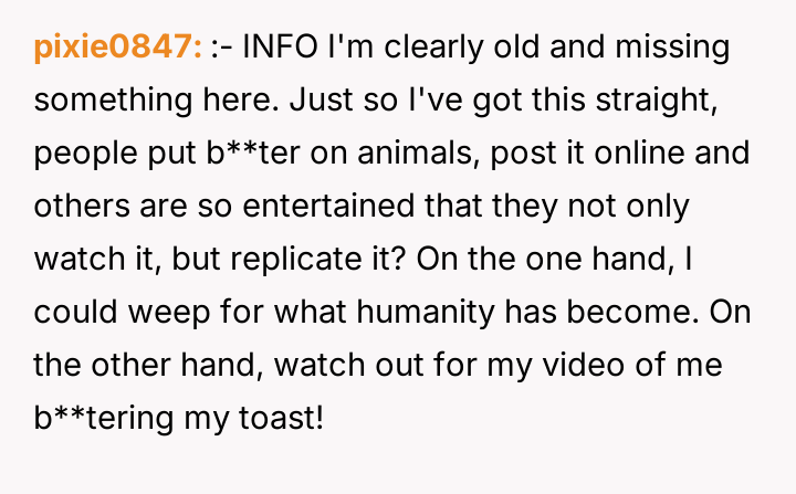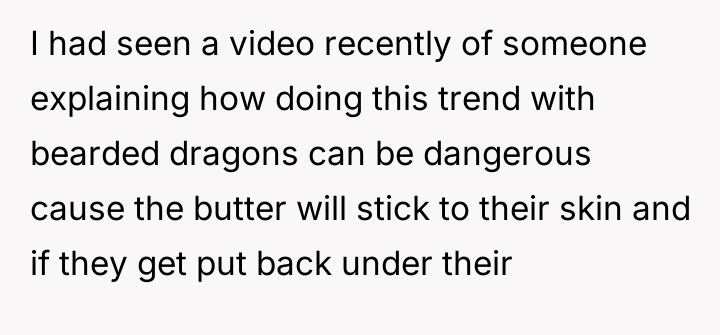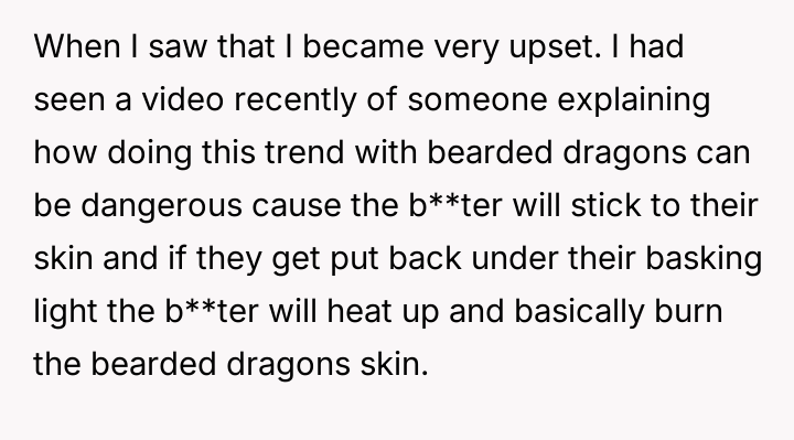After reading through the Reddit comments, it’s clear that many people empathize with the original poster’s concern for Phil’s well-being. Most commenters agree that while TikTok trends can be fun, they should never come at the expense of an animal’s health or comfort. Many also pointed out that some trends, like the butter one, are harmless for certain pets but can be harmful for others, like bearded dragons, whose skin and habitat requirements are quite sensitive.