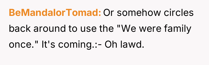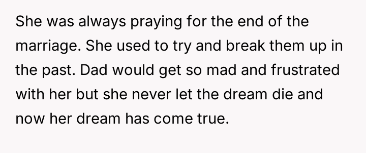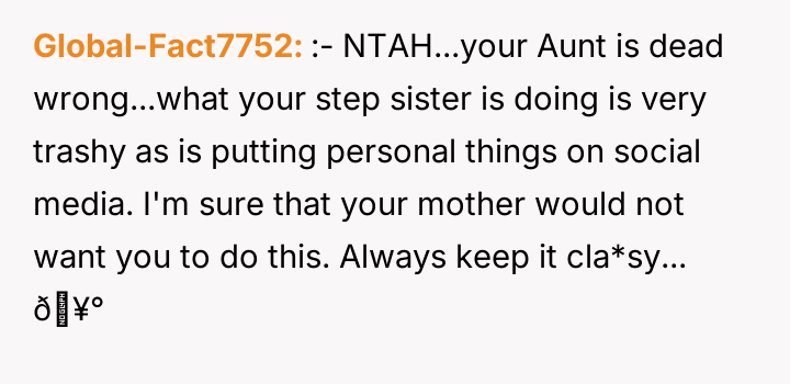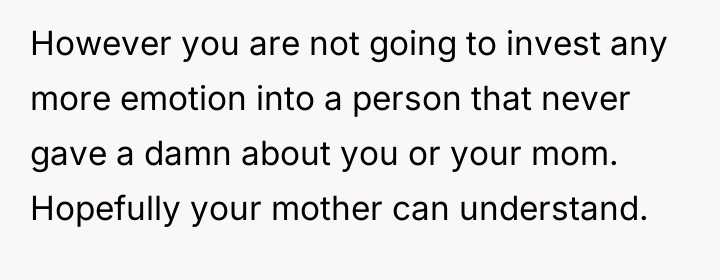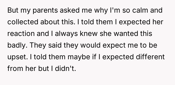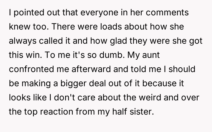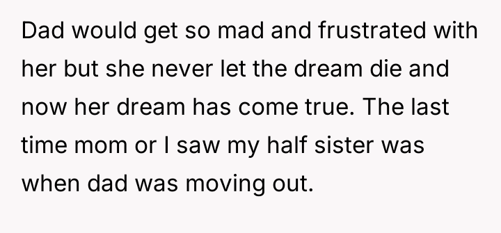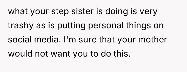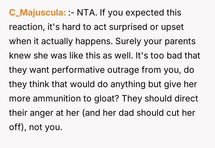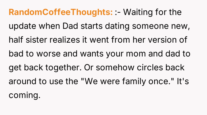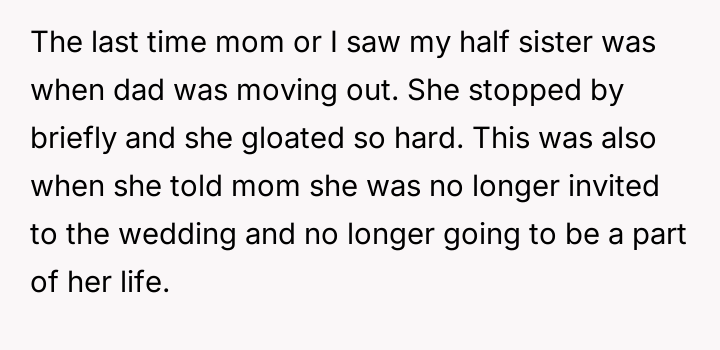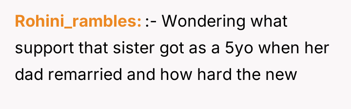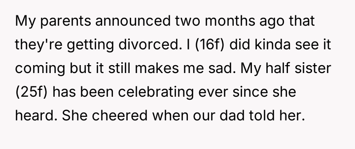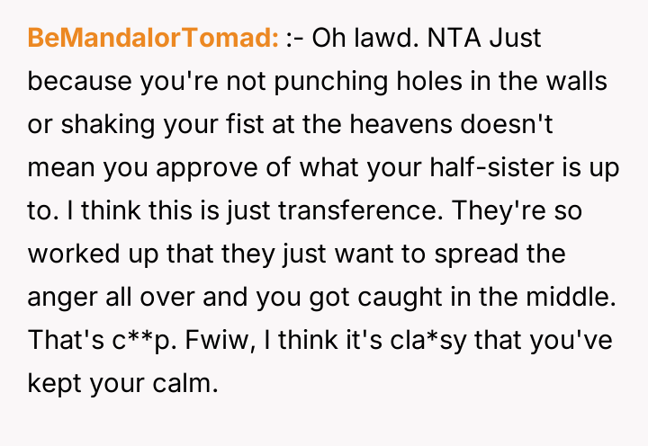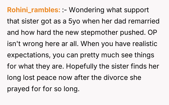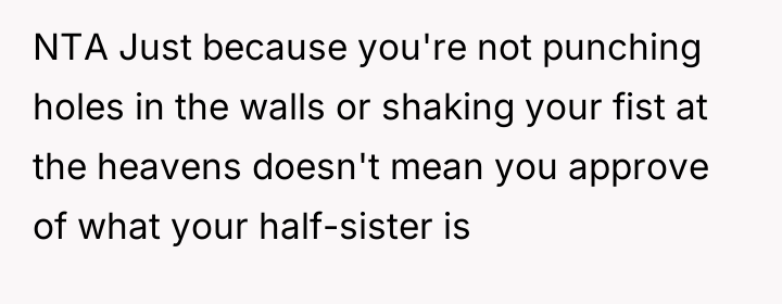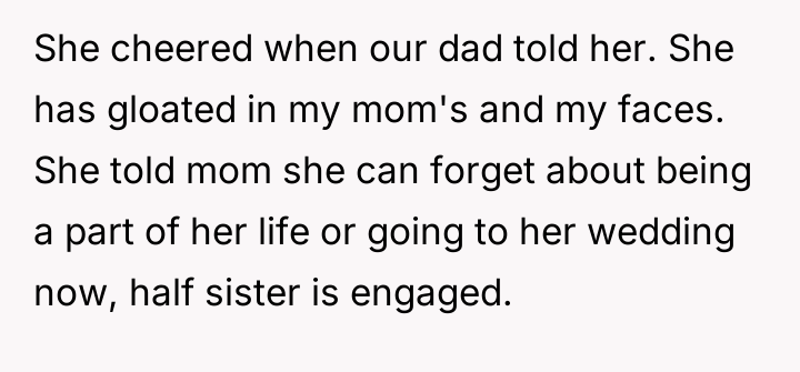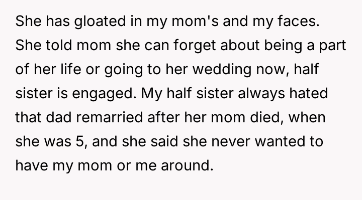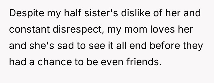 Reading through the Reddit comments, it's clear that many readers empathize deeply with the narrator's feelings of sadness and confusion amid the family turmoil. People expressed sympathy for the mother and daughter, who are caught in the crossfire of the half sister's long-standing resentment and hostility. Many commenters also highlighted the pain of navigating blended family dynamics and the complexities of grief, especially considering the half sister's unresolved feelings about her biological mother's death and her father's remarriage.