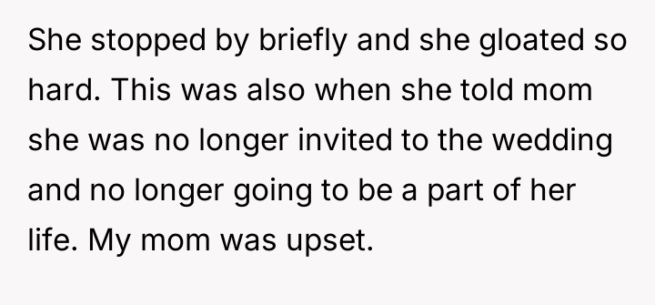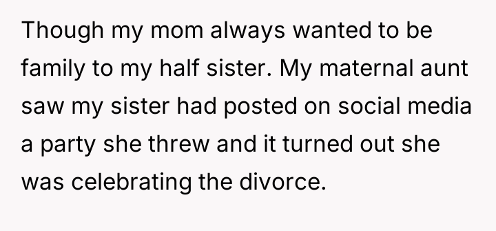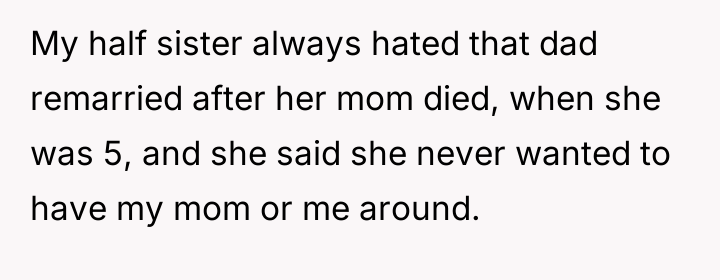 In my view, this story underscores the emotional challenges that come with divorce and blended families, particularly when past wounds remain unhealed. The half sister’s behavior, while hurtful, seems rooted in longstanding grief and bitterness, which might benefit from empathy and potentially professional support. For the narrator and her mother, setting healthy boundaries while seeking support is crucial as they move forward. Ultimately, the hope is that time and understanding may soften these fractured relationships, allowing for healing on all sides.
