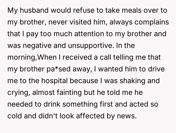 Amid the heartbreak, she faced not only the pain of loss but the cold distance of those who should have stood beside her. While she poured love and care into her brother's final days, her husband turned away, unable to understand the depth of her devotion. In the quiet aftermath, she is left to grapple with grief and the haunting question of what it truly means to be family.