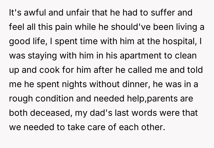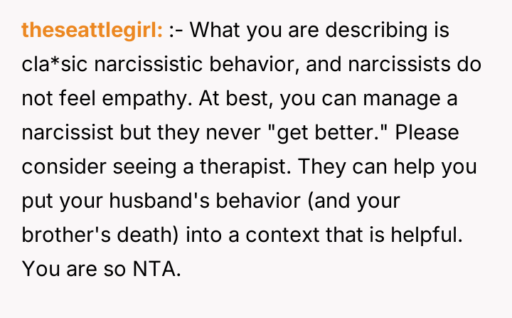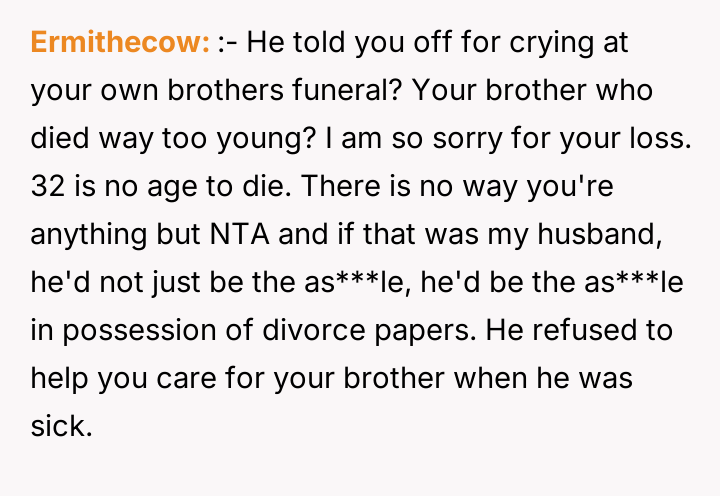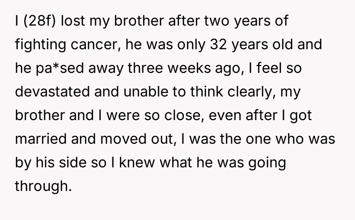After reading the story and the Reddit comments, it’s clear that the pain of losing a close sibling to cancer is profound and deeply personal. Many commenters expressed sympathy for the original poster (OP) and criticized the husband’s lack of support during such a difficult time. The consensus seems to be that OP was doing what any caring sister would do, and her husband’s refusal to help or even visit her brother was insensitive and harmful. Several users encouraged OP to prioritize her own healing and seek support from friends or therapy, given the emotional toll she’s enduring.