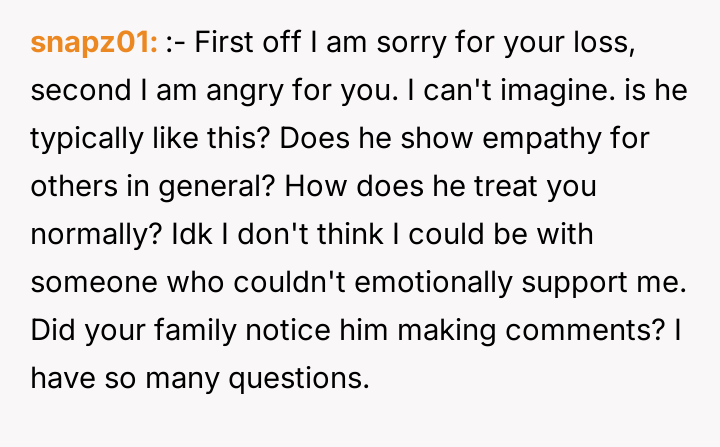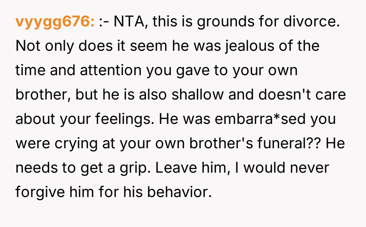 In my opinion, this story highlights the importance of empathy and support within families during times of crisis. It’s heartbreaking to lose a loved one, and having a partner who understands and shares the burden can make a significant difference. The husband’s behavior was disappointing, but OP’s devotion to her brother is commendable. Moving forward, OP should surround herself with people who uplift her and allow herself the time to grieve and heal.