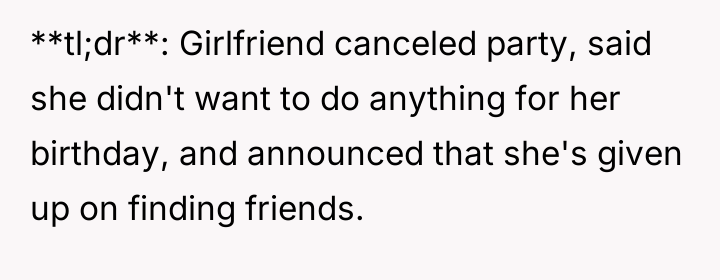 After reading through the Reddit comments, it’s clear that many people empathize deeply with OP’s girlfriend's feelings of rejection and loneliness. Some commenters suggest that while the party cancellation was unfortunate, it’s important to recognize the impact social exclusion can have on someone's mental health. Others emphasize the value of simply being there for a loved one during their low moments, rather than pushing for activities or solutions too quickly, which might feel overwhelming.
