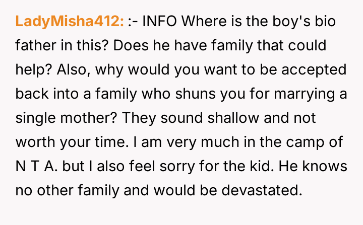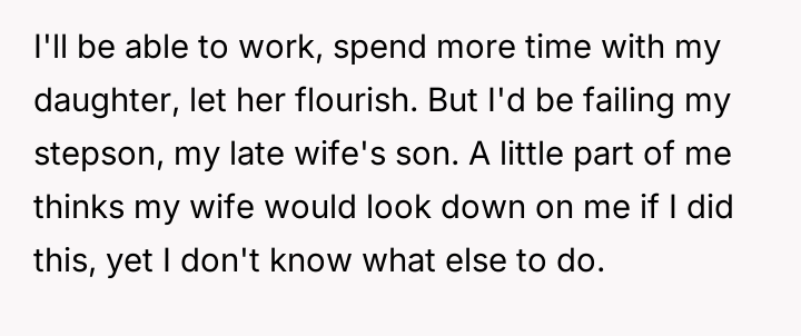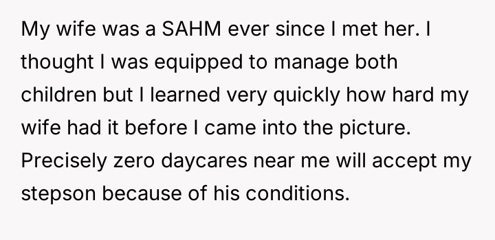 After reading through the Reddit comments, it's clear that many people empathize deeply with this father's struggles in balancing the care for his two children, especially given the complexity of his stepson's medical and developmental needs. Commenters praised his dedication and sacrifice, especially quitting his dream job to provide the care his stepson requires. Many offered support and shared resources for special needs parenting, emphasizing the importance of community and seeking help where possible.