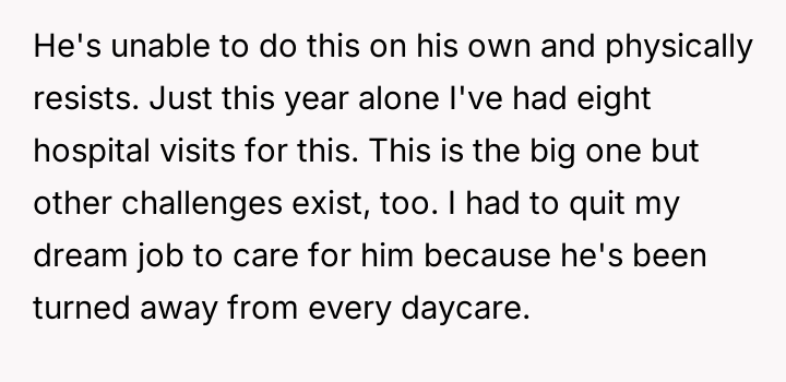 In conclusion, this story highlights the immense challenges faced by caregivers of children with special needs, and the emotional and physical toll it can take. While the father’s situation is heartbreaking, the outpouring of support from the Reddit community shows that he is not alone. It also serves as a reminder of the gaps in accessible care and support for families like his, pointing to a broader need for systemic change.
